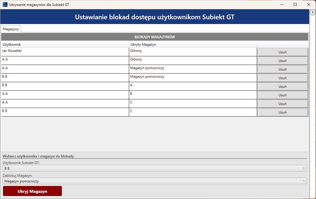 Po uruchomieniu aplikacji i podłączeniu się z bazą podmiotu Subiekta GT możemy przystąpić do konfiguracji dostępu. Program wczyta wszystkich użytkowników Subiekta GT oraz magazyny z tego podmiotu. Możemy wybrać użytkownika i magazyn, który chcemy mu zablokować. Oczywiście możemy zablokować wiele magazynów dla jednego pracownika. Cała operacja jest odwracalna, bo w każdej chwili możemy usunąć blokadę użytkownikowi.