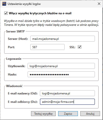 - Wysyłanie logów na e-mail - w przypadku działania w trybie wsadowym lub z poziomu timera program może teraz wysyłać na adres e-mail informacje o krytycznych błędach.