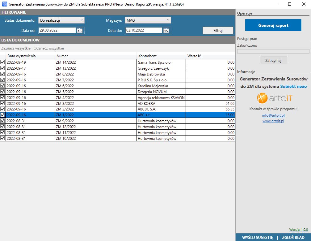 Moduł dodatkowy dla Subiekta nexo PRO wyliczający sumaryczną ilość surowców na dokumentach ZM (Zlecenia Montażu). Pozwala na wygenerowanie podsumowania, na którym widzimy ile łącznie danego towaru brakuje na magazynie do wyprodukowania/wytworzenia danego kompletu.