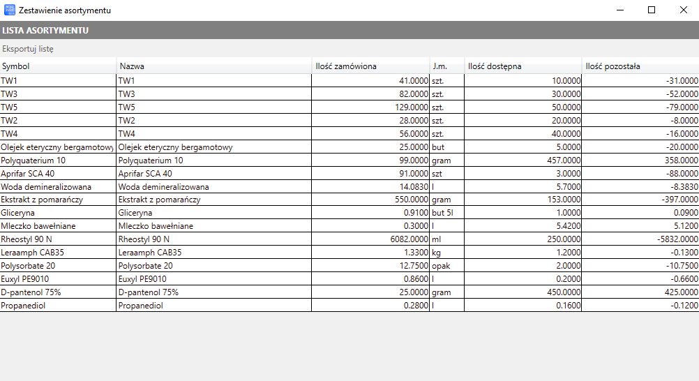 - Wygenerowanie zestawienia materiałów potrzebnych do wyprodukowania kompletów